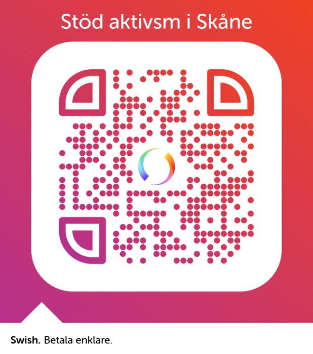Stöd aktivism i Skåne via Swish: 123 668 29 00 , lämna gärna meddelande ”donation”.