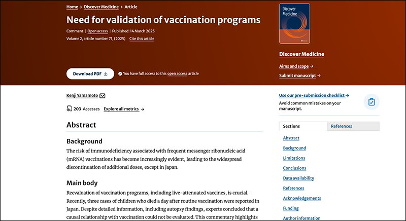 ”Omvärdering av vaccinationsprogram, inklusive levande försvagade vacciner, är avgörande,” argumenterade Dr. Kenji Yamamoto. Han påpekade att medan andra nationer har förändrat sina mRNA-vaccinationsscheman – och trots tre nyligen rapporterade vaccinkopplade dödsfall bland barn – har vaccinationsprogrammet fortsatt i Japan, som i oktober 2024 är inne på sin åttonde dos av coronavaccinet.