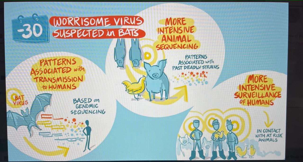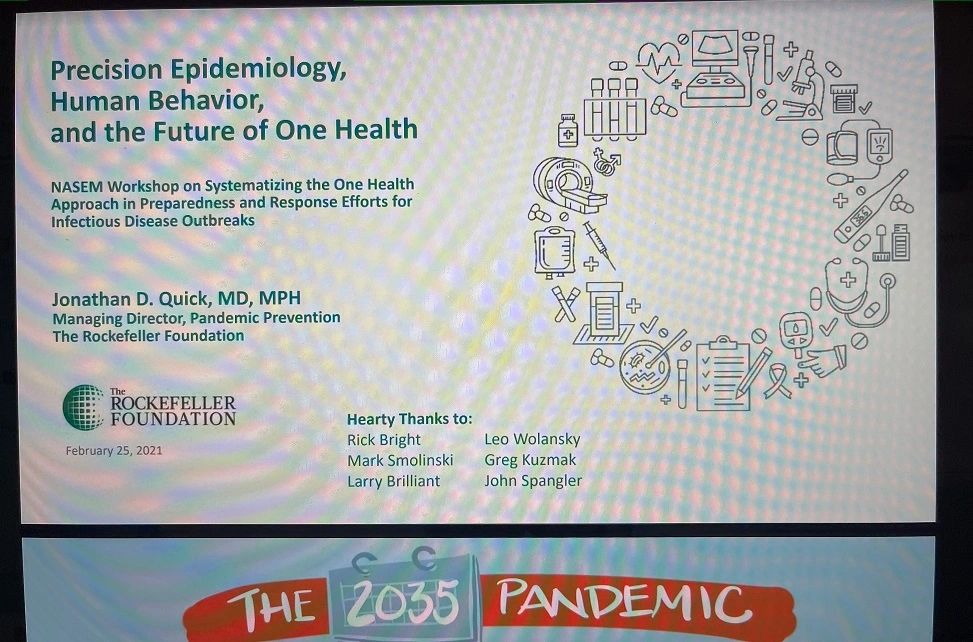 Bildspelet, med titeln ”Precision Epidemiology, Human Behavior, and the Future of One Health”, riktar ett ”varmt tack” till den tidigare tjänstemannen vid USA:s hälsodepartement (Department of Health and Human Services) Rick Bright, som var medlem i Joe Bidens team för hantering av coronaviruset. Planen beskriver globalisternas förväntade respons på ”pandemin 2035”.