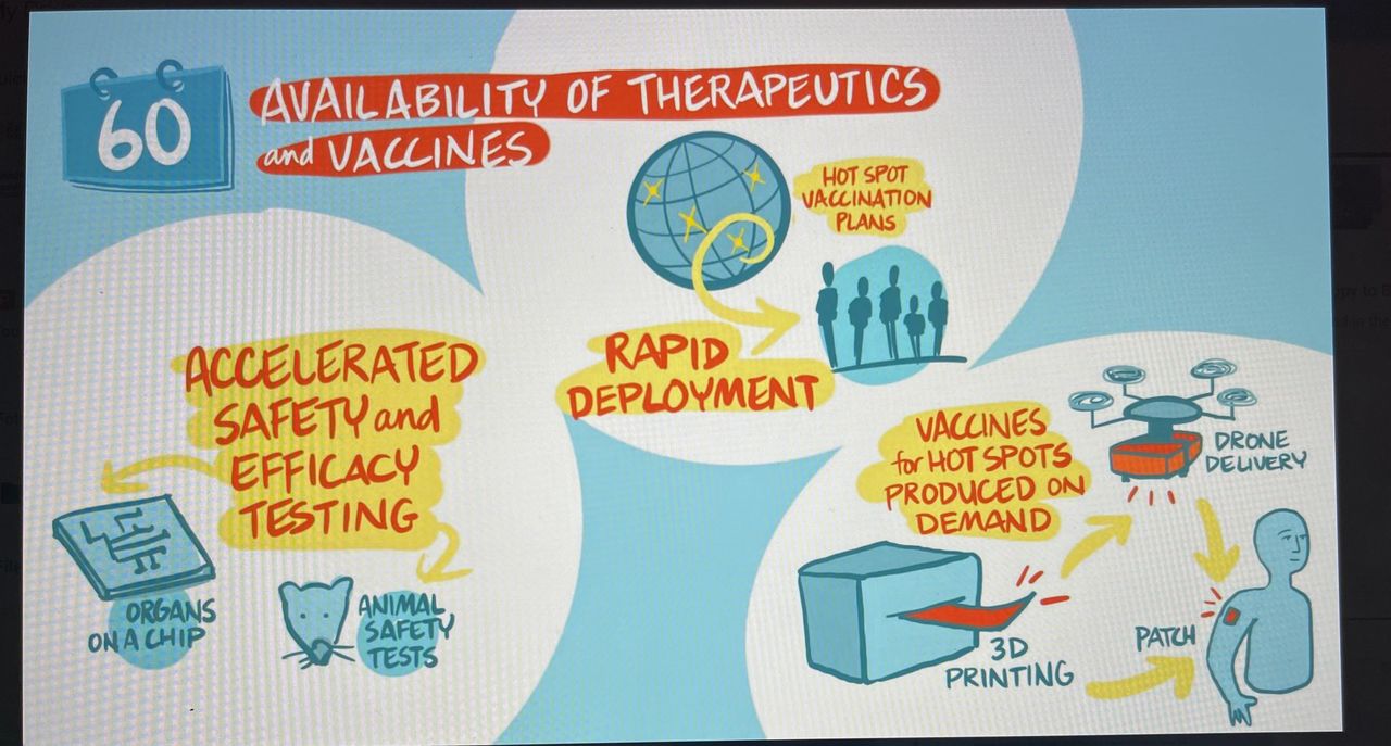En bild visar en process för ”snabb utplacering” som inkluderar 3D-utskrivna vaccinplåster, ”producerade vid behov” och levererade via ”drönarleverans” till enskilda mottagare.